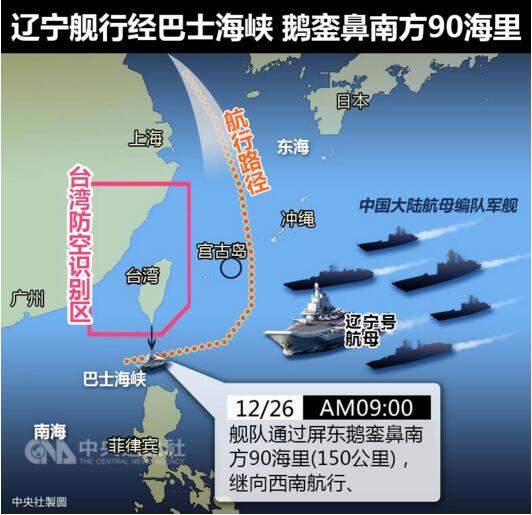 臺“國防部”表示,遼寧號航母在5艘作戰艦艇護衛下,于25日晚間8時沿臺灣東南“防空識別區”外20海里經巴士海峽航行。