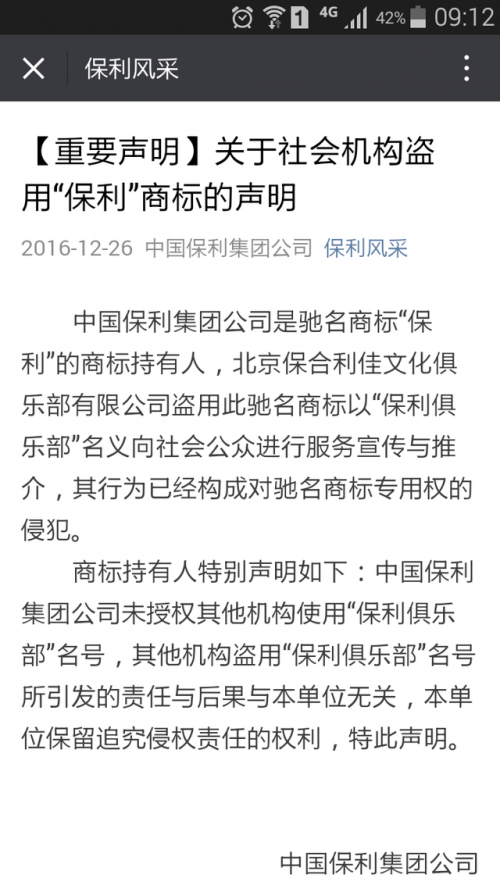 中新經緯客戶端12月26日電 昨日,北京警方查處保利俱樂部、藍黛俱樂部、麗海名媛俱樂部等三個涉黃場所引發關注。26日,中國保利集團在其官方微信發布聲明,稱北京保合利佳文化俱樂部有限公司盜用“保利”馳名商標,以“保利俱樂部”名義向社會公眾進行服務宣傳與推介,其行為已經構成對馳名商標專用權的侵犯。