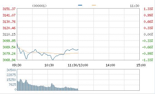 今日兩市低開后市場震蕩走低,板塊幾乎盡墨,臨近午間收盤金融股護盤逆市拉升,滬指盤中一度跌逾1%下探3068點。截止午間收盤,滬指跌0.78%報3085點,深成指跌0.83%報10115點。 分析認為,由于處在年末時點,短期資金面仍然緊張。央行公開市場今日凈回籠700億元。