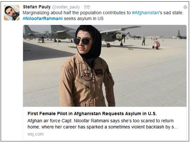 据路透社12月26日报道,阿富汗首名女固定翼飞机飞行员、空军上尉拉赫马尼(Niloofar Rahmani)今年25岁,2012年从飞行学校毕业,能够驾驶C-208军用运输机。曾于2015年获美国国务院颁发“勇敢女性奖”(Women of Courage)。表彰她成为塔利班当局倒台后,该国女性地位崛起的象征。