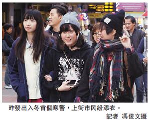 自天文台昨午發出「寒警」後,氣溫明顯下降,市區氣溫由昨日下午1時的19℃,急降至晚上7時的14.1℃;大帽山亦由下午1時的9℃,下降至晚上10時的2.5℃。