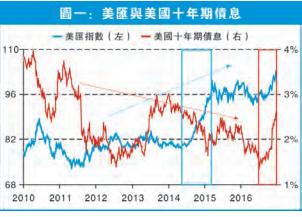 不過,當聯儲局的加息態度愈來愈強硬后,兩市投資者終會殊途同歸。就算明年美國加息次數或不如聯儲局所預計的三次,只要多一至兩次,由去年底開始的加息周期已經開啟是明顯不過的事,這是債市投資者不能不相信的。由是觀之,若美國十年期債息由今年7月開始的急抽是開始反映聯儲局開展的加息周期的話(見圖一的紅色方框),情况或有如美匯由2014年中開始急升般的長升周期。