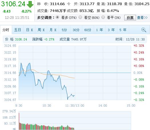 早盤滬指沖高回落逼近3100點,PPP、股權轉讓、高送轉以及次新股表現活躍,權重股繼續萎靡,資金觀望氛圍濃厚。截至午間收盤,滬指跌0.27%報3106點,深成指跌0.23%報10206點。
