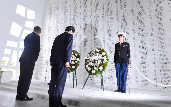 安倍和欧巴马 珍珠港纪念馆献花