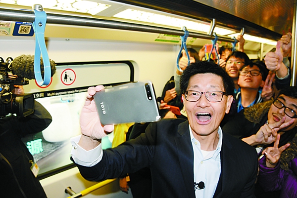 港鐵行政總裁梁國權與市民大玩selfie,見證南港島線通車時刻。