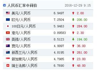 中國人民銀行授權中國外匯交易中心公布,2016年12月29日銀行間外匯市場人民幣匯率中間價為:1美元對人民幣6.9497元,1歐元對人民幣7.2504元,100日元對人民幣5.9463元,1港元對人民幣0.89583元,1英鎊對人民幣8.5123元,1澳大利亞元對人民幣4.9997元,1新西蘭元對人民幣4.8195元,1新加坡元對人民幣4.7985元,1瑞士法郎對人民幣6.7690元,1加拿大元對人民幣5.1342元,人民幣1元對0.64316馬來西亞林吉特,人民幣1元對8.6992俄羅斯盧布,人民幣1元對1.9931南非蘭特,人民幣1元對173.89韓元,人民幣1元對0.52796阿聯酋迪拉姆,人民幣1元對0.53929沙特里亞爾,人民幣1元對42.6313匈牙利福林,人民幣1元對0.60751波蘭茲羅提,人民幣1元對1.0256丹麥克朗,人民幣1元對1.3212瑞典克朗,人民幣1元對1.2521挪威克朗,人民幣1元對0.50861土耳其里拉,人民幣1元對2.9787墨西哥比索。