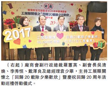 【香港商報訊】記者謝巧玲報道:香港中華廠商聯合會會長李秀恒昨日在傳媒宴上公布未來一系列慶祝香港回歸活動,頭炮是12月31日在工展會舉辦的除夕倒數活動,當晚特別安排10時半起的時段,招待約1萬名基層家庭成員,每位獲贈300元現金券供場內購物。屆時政務司司長林鄭月娥、勞工及福利局局長張建宗等多位政府官員將出席,聯同該會首長與市民一同歡度除夕,倒數迎接2017年。