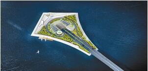 为尽可能减小阻水效应,西人工岛岛形采用了分水效果较好的菱形,形似中国传统的风筝。从设计图上看,桥梁段构成了风筝线,枢纽立交轮廓就像线盘。“箭头”造型建筑内空,中央用作监控室,两翼作为设备用房。未来,人们无论在周边,或乘飞机或驱车到达该地区时,都能从不同角度看见通道桥梁和人工岛。