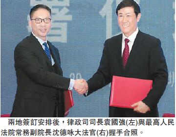 【香港商報网訊】記者周偉立報道:律政司司長袁國強與最高人民法院常務副院長沈德咏大法官,昨日在深圳簽訂香港特別行政區與內地就民商事案件相互委託提取證據的安排。