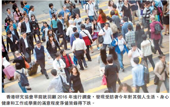 【香港商報網訊】記者周偉立報道:香港研究協會早前就回顧2016年進行調查,結果昨日公布,發現在個人方面,受訪者今年對其個人生活、身心健康和工作或學業的滿意程度凈值雖然均呈正值,但與去年同類調查比較,3項滿意度凈值皆錄得下跌。展望明年,有逾三成人預計明年生活較今年「沒有改變」,而認為「變好」的占近三成,反映市民對來年生活展望好壞參半。協會促請政府及各黨派反思,并深入了解市民在各方面未感滿意的根本原因,切實回應市民訴求。