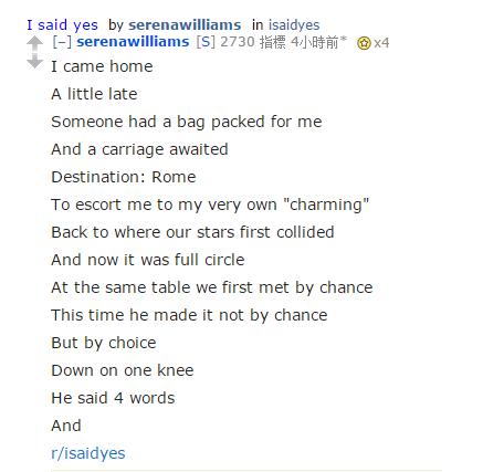 奧哈尼安在社交網絡寫道:“她答應了”,并配了一副漫畫,漫畫的內容就是他跪在遞上求婚,而小威接受了鉆戒的畫面。小威也在個人社交媒體上分享了被求婚的瞬間,“今天回家較晚,某人為我準備了特殊的包裹,一輛馬車等著我,目的地寫著羅馬,那是我們第一次相遇的地方,現在就像是回到了起點,他單膝跪地,說出那4個詞,我答應了他。”