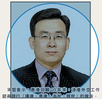 【香港商報网訊】記者吳韻玲、葉佩瑜報道:剛由外交部駐港特派員調任港澳辦副主任的宋哲撰文回顧工作表示,香港回歸近20年來,涉港外交工作踐行「護港、惠港、為民、親民」的做法,證明了「一國兩制」實踐的成功與優越性,始終是國家外交工作的一部分;為中國特色大國外交添磚加瓦,亦為香港的發展保駕護航。涉港外交「護港惠港為民親民」