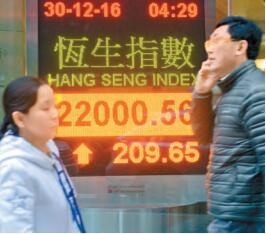 【香港商報网訊】2016年最后的交易日港股造好,昨日恒指連升第三日,大市高開后反覆造好,高見22069點,收市報22000點,升209點或0.96%(圖),成交額537億元,收復十天移動平均線(21821點),國指升82點或0.9%,報9394點。過去一年大市有波幅無升幅,全年計恒指累積升86點或0.4%;國指則累跌266點或2.8%。