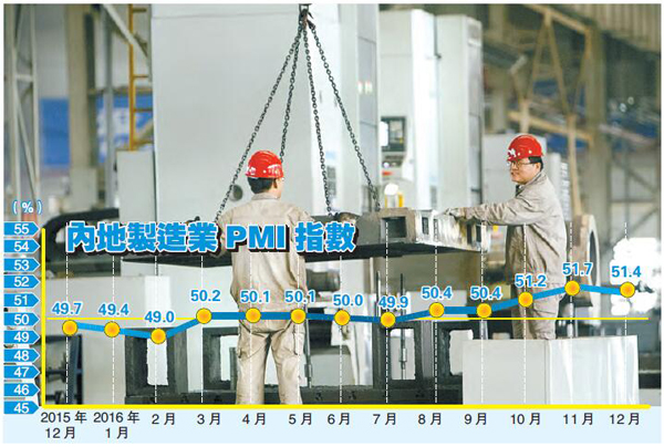 【香港商報訊】國家統計局、中國物流與采購聯合會昨日聯合發布數據,2016年12月份中國制造業采購經理指數(PMI)為51.4%,比上月下降0.3個百分點。國務院發展研究中心研究員張立群認為,經過連續3個月上升后,12月份PMI指數小幅下降,但繼續保持在榮枯線以上,經濟增長趨穩態勢較為明確。另外,從2016年全年來看,官方制造業PMI指數穩步小幅回升,市場需求有所回暖,但企業成本壓力也在逐漸加大。
