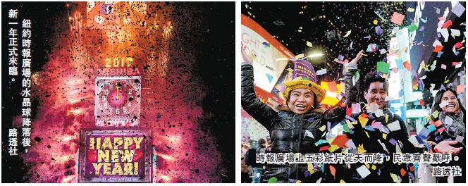 法新社報道,在紐約地標這處有巨大霓虹燈的十字路口,巨大水晶球在當地時間除夕晚約6時升至塔式建築43公尺高頂。紐約巿長白思豪依傳統在凌晨零時前一分鐘按鈕啟動水晶球緩降。接下來,五彩紙片從天而降,民眾齊聲歡呼。自1907年以來的這項年度新年傳統,僅1942和1943年停辦。