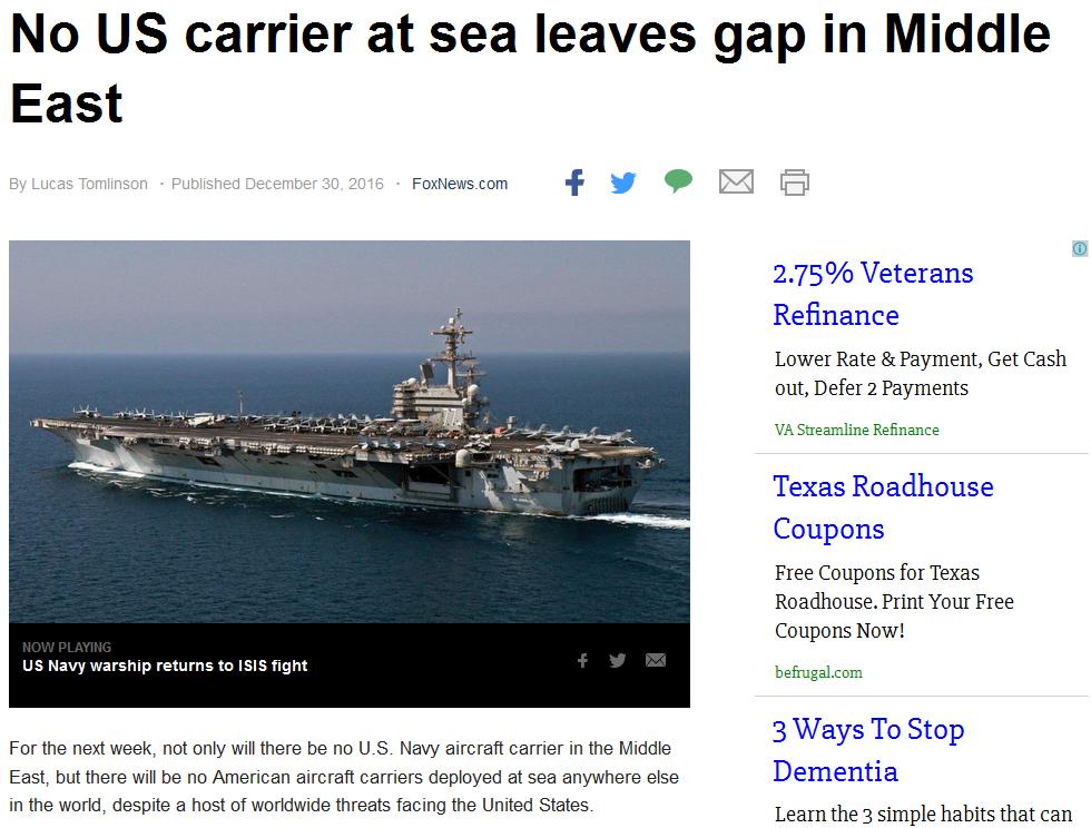 央視中文國際頻道消息,美國福克斯新聞網2016年12月30號報導稱,未來一周美國將撤回遊弋在全球海域的所有航母戰鬥群,包括在中東海域打擊極端組織的艦船,這是二戰以來首次全球海域中沒有一艘美國航母遊弋。在地中海和波斯灣部署7個月的艾森豪航母已返回美國本土,而準備接替它的布希號航母因為軍備預算削減等問題,目前還停泊在母港,已延期六個月部署。