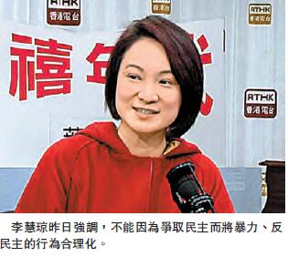 民建聯前日舉行創黨25周年啟動禮,明言堅持走愛國愛港道路,會維護「一國兩制」、實現「優質民主」。李慧瓊昨日出席電台節目時強調,民建聯追求的是「優質民主」,亦稱不能把所有事件歸咎為「未達到真普選」。她又指出,在本港落實《基本法》所給予的雙普選過程中,出現「反民主行為」。她不諱言,香港不可以因為爭取民主,而將暴力、反民主的行為合理化,不應有言語、行為上的暴力。她舉例指,即使有民主的國家,也有同樣的問題,更反問美國的總統選舉是否「真普選」。