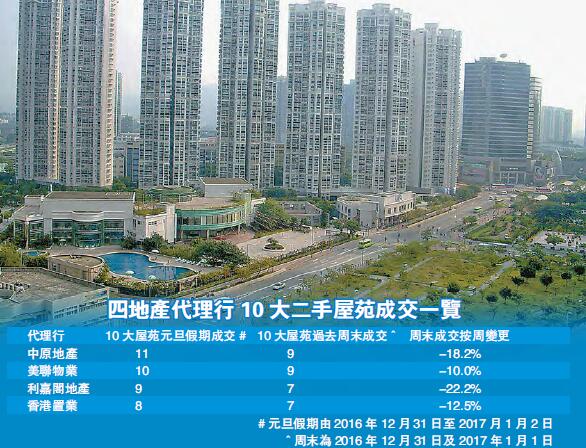 4間地產代理行中,中原地產及美聯物業都表示,元旦假3日內於10大屋苑錄有雙位數成交。美聯錄約10宗成交,比上年元旦長周末的13宗少約23%,4個屋苑未「開齋」,天水圍「嘉湖山莊」成交量最高,占3宗成交。中原共錄得11宗成交,「嘉湖山莊」成交量同樣最高,貢獻了4宗成交。