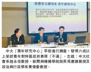 中大香港亞太研究所轄下「青年研究中心」早前進行「香港青年的社交媒體應用及政治參與」電話問卷調查,以隨機抽樣方式訪問829名15歲至29歲市民。調查結果顯示,46.4%的受訪青年表示以社交媒介為獲得公共事務諮詢的主要來源。超過六成受訪者表示「非常唔滿意」或「幾唔滿意」特區政府的表現,並「非常唔信任」或「幾唔信任」政府。