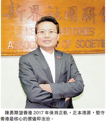 2017年繼續是選舉年,將會於3月選舉行政長官。對於今年,陳勇期望香港最關鍵的是要保持正軌,正本清源,堅守香港最核心的價值即法治,因這是本港經濟及發展得以繼續繁榮、穩定的根基。他直言本港應依照憲法、《基本法》等各方面的規則、法律,阻止偏離軌道、有違法治的事物,一切依法辦事。