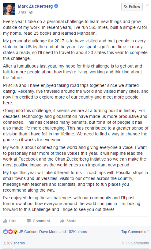文章稱:“2017年,我的個人挑戰是拜訪美國每一個州,與那裏的人會面交流……去年出現了一些混亂,我希望自己可以通過該挑戰積極走出去,與更多的人交流,了解他們的生活、工作以及對未來的思考。”