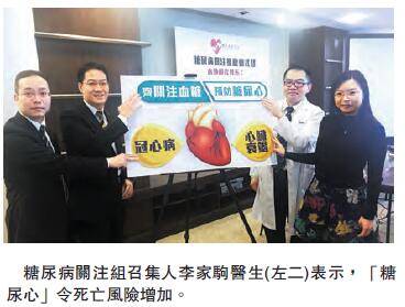 糖尿病關注組召集人內分泌及糖尿科專科李家駒醫生表示,現時全港約有70萬人患有糖尿病,糖尿病因家族病史、過度肥胖、欠缺運動或不良飲食等引起,隨老齡化加劇,患病數目有上升趨勢,預計2030年患者數激增至102萬人。他指出,長期高血糖水平會令血管受到破壞,從而引發血管併發症狀「糖尿心」、中風、糖尿眼、糖尿腎及神經病變等。最令人擔心的病症是「糖尿心」包括冠心病和心臟衰竭等,外國研究顯示,糖尿病患者因「糖尿心」而死亡的風險高出2至4倍,十分驚人。