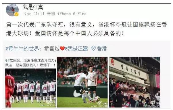 5日,汪嵩在微博上再次表达爱国之情:“省港杯夺冠让国旗飘扬在香港大球场!爱国情怀是每个中国人必须具备的!”