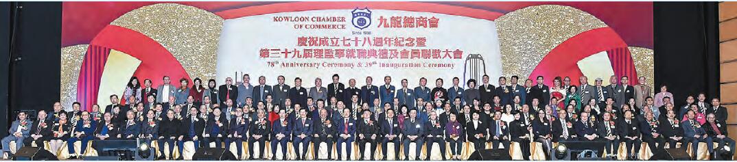 九龍總商會成立78周年暨第三十九屆理監事就職典禮及會員聯歡大會日前於香港會議展覽中心舉行,中聯辦副主任楊建平出席并擔任主禮嘉賓,為新任理事長李鳳翔、永遠會長李光華等頒發委任狀,并頒發龍總杰出精英金獎。圖為嘉賓與該會首長大合照。伽莉攝影報道