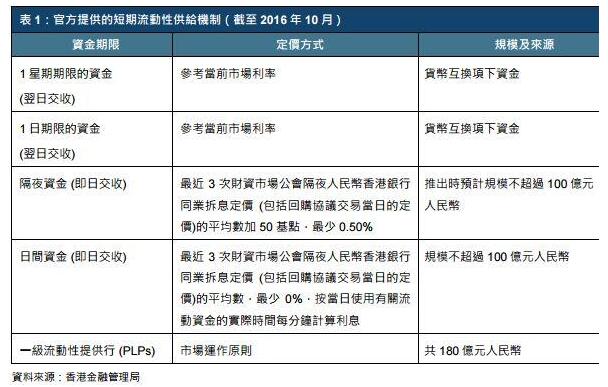 短期流動性方面,離岸市場的人民幣資金供應管道分為官方及市場融資兩個層面。官方提供的短期流動性,包括香港金融管理局(金管局)向市場提供的一日及一周期限流動資金安排(兩者均為翌日交收),以及隔夜流動資金安排(即日交收);2014年為回應滬港通的開通,香港金融管理局又推出每日上限100億元的拆借資金,以滿足滬港通開放后離岸市場對人民幣的即時需求。另外,還同時推出香港離岸人民幣市場的一級流動性提供行(CNH Primary Liquidity Providers,簡稱PLPs)服務,由金管局為7間PLPs提供各20億元人民幣回購服務(repo facility),以支持擴展離岸人民幣市場的莊家活動及其他業務。