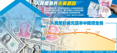 去年10月1日,人民幣正式加入國際貨幣組織的特別提款權(SDR)一籃子貨幣后,雖然人民幣邁向國際化一大步,但美國加息預期持續升溫,美元走勢愈來愈強,加上美聯儲去年12月份決定加息,將聯邦基金利率從0.25%至0.5%,調升到0.5%至0.75%。由於息差拉闊,對人民幣匯市壓力持續上升,2016年人民幣兌美元,累計貶值了6.6%,創有紀錄以來最大年度貶值幅度。