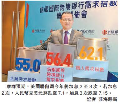 另外,信銀國際公布今年1季度跨境銀行需求指數,錄值56.4,比上季度下降0.4;企業需求分指數與個人需求分指數則分別錄值55.0與62.1,跌0.7與1.2,反映在人民幣貶值預期及其他市場變化下,內地企業與個人對於香港跨境銀行服務需求的增長速度溫和走低。從今季度起,在企業需求分指數與個人需求分指數下分別引入法規松緊預期子指數,以反映內地企業與個人對跨境銀行服務相關的法規將會放松還是收緊的預期。