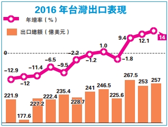 台灣財政部統計處昨日公布2016年12月及全年進出口貿易概况,12月出口年增14%,連續三個月正增長,創近4年最大增幅,但受上半年出口衰退近1成的拖累,全年出口仍減1.7%,連續兩年負增長。