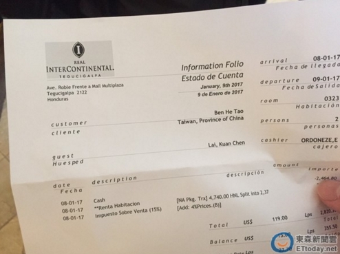 蔡英文“出訪”隨團記者拍攝的洪都拉斯酒店賬單。(圖片來源:東森新聞雲)
