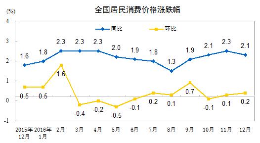 12月份,CPI環比上漲0.2%,同比上漲2.1%。2016年全年CPI同比上漲2.0%,漲幅比2015年擴大了0.6個百分點。