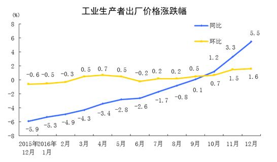 12月份,PPI環比上漲1.6%,同比上漲5.5%。2016年全年PPI同比下降1.4%,降幅比2015年收窄了3.8個百分點。