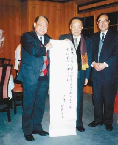 金庸(中)为《神雕侠侣》漫画版在《香港商报》刊出欣然题字,旁为张俊生(右)和李祖泽。