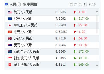 1月11日消息,早間外匯交易中心發布公告,人民幣(6.9179, 0.0000, 0.00%)匯率中間價報6.9235,較前一交易日小幅貶值1個基點。