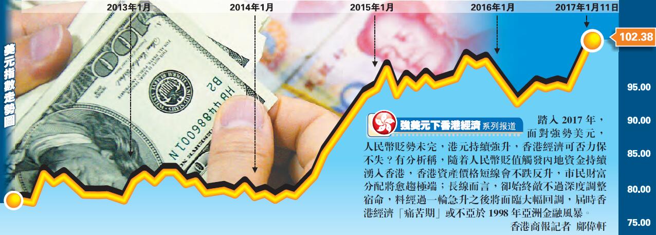 踏入2017年,面對強勢美元,人民幣貶勢未完,港元持續強升,香港經濟可否力保不失?有分析稱,隨著人民幣貶值觸發內地資金持續涌入香港,香港資產價格短線會不跌反升,市民財富分配將愈趨極端;長線而言,卻始終敵不過深度調整宿命,料經過一輪急升之后將面臨大幅回調,屆時香港經濟「痛苦期」或不亞於1998年亞洲金融風暴。香港商報記者 鄺偉軒