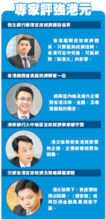 而香港總商會高級經濟師董一岳則認為,面對港元強勢與人民幣匯價疲弱夾擊,內地及海外企業對香港法律、金融、及專業服務的需求將會降低,進而削弱香港相關職位數目。他說:「當前,香港多達1300位事務律師可為海內外企業提供法律顧問服務;昔日港元弱勢時,香港事務律師一直吃香,但今天港元匯價強勢,又會否導致內地企業選擇內地專業服務?這是需要留意的。」