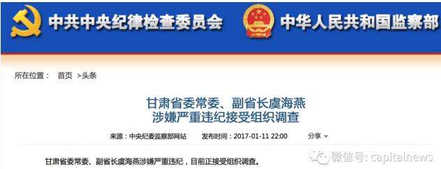 11日晚10點,中紀委發布消息:甘肅省委常委、副省長虞海燕涉嫌嚴重違紀,目前正接受組織調查。