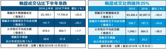 回望2016年輪證市場交投,法興證券(香港)上市產品銷售部副總裁蔡秀虹表示,去年窩輪與牛熊證佔大市成交比例按年計維持在25%。當中,由於下半年市場經歷英國脫歐,美國大選,深港通開通,人民幣貶值等事件,市場更添不明朗因素,投資者的入市意欲也降低,導致下半年輪證成交急跌。