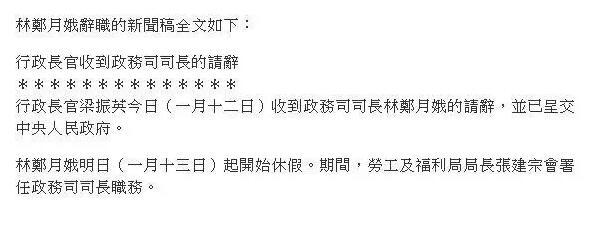 1月12日下午四時,香港特區政府公布:行政長官梁振英今日收到政務司司長林鄭月娥的請辭,并已呈交中央人民政府。林鄭月娥從1月13日起開始休假。期間,勞工及福利局局長張建宗將署任政務司司長職務。