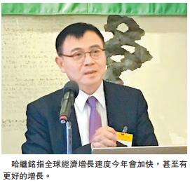青委主任章曼琪致歡迎辭后,哈繼銘展開其深入獨到的分析。他指,全球經濟增長速度今年會快於去年,甚至有更好的增長,去年2.5%,今年有望達到2.7%,甚至更高水平,「區域分布來看,美國經濟速度有很大可能性加快,其中特朗普當選前美國經濟已向前走,包括就業情况大幅改善,房地產向好,消費旺盛,消費者信心增強。而且特朗普競選時指上任后會推出財經刺激政策,如減稅、加強基礎設施、加大軍費開支,放松行業管制,如能源、金融,這些措施至少短期內對經濟有提升作用,估計美國今年會有1.6%的增長,明年增長2%以上。」