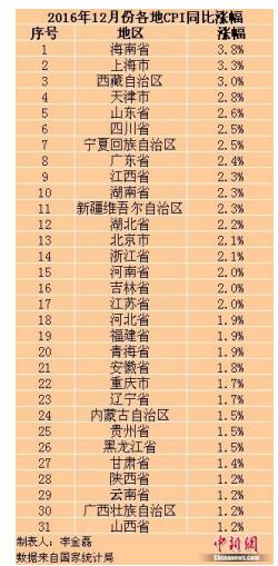 在31個省份中,海南、上海、西藏這三地的2016年12月份CPI漲幅處于“3時代”。其中,海南的漲幅為3.8%,上海的漲幅為3.3%,西藏的漲幅為3%。