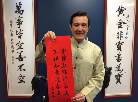 马英九表示,通过这副春联先向大家拜早年,祝大家鸡年好运连连,也祝愿台湾风调雨顺。
