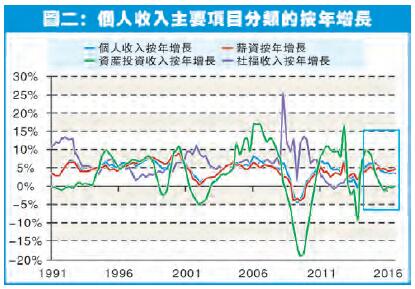 不過,筆者再仔細觀察,這些由勞工部(BLS)編制的與由經濟分析局(BEA)提供的工資數據大有不同。圖一見到,以美國經濟按年增長對比兩局的工資增長數據,金融海嘯后BLS的平均時薪增長緩步向上,反之BEA的個人收入增長卻跟隨美國經濟增長逐步下跌,情況大相逕庭。大家可能認為兩批數據不能比較,因為BEA的個人收入不單包含工資,還有投資收入等。