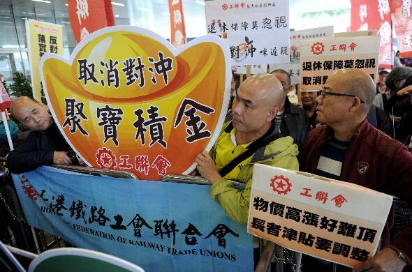 香港有团体立法会示威表达诉求。 1月18日,香港行政长官梁振英在立法会发表2017年施政报告。有政团或团体在立法会示威区表达诉求。当中工联会要求完善退休保障制度等。香港中通社图片