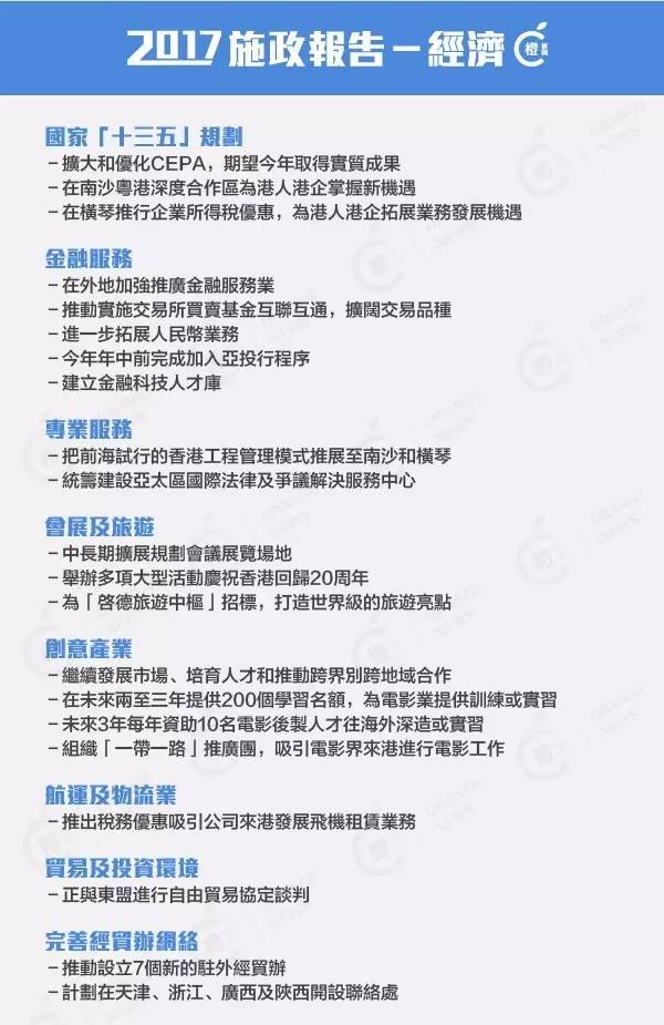 10. 「十三五」的《港澳專章》,確立香港在國家發展中的功能定位,包括鞏固和提升香港作為國際金融、航運、貿易3大中心地位;明確支持香港專業服務朝高端高增值方向發展,支持香港發展創新及科技和法律及解決爭議服務等。《港澳專章》也強調深化內地與香港合作,支持香港參與國家雙向開放、「一帶一路」建設,為香港開拓新市場。