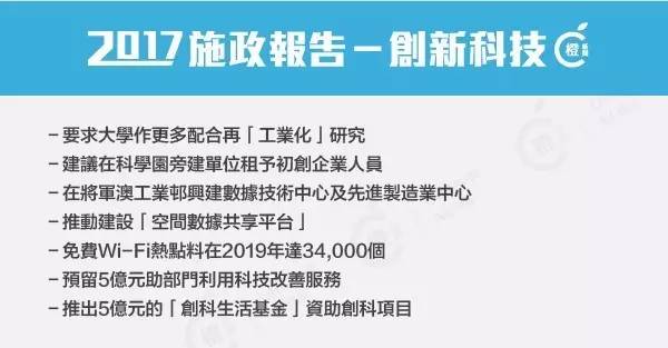 54.創新及科技(創科)不是口號,而是提高香港經濟和社會發展速度的新動力。香港的創科應用,多方面明顯落後於中國內地。自從創新及科技局(創科局)成立以來,過去一年,香港的創科氛圍顯著提升,世界頂級科研機構相繼在香港落戶:麻省理工學院在香港成立了首個國外創新中心;瑞典卡羅琳醫學院在科學園成立該院200年歷史以來的首間國外研究中心;中國科學院的廣州生物醫藥與健康研究院,宣布在科學園設立「廣州香港幹細胞及再生醫學研究中心」;阿里巴巴集團啓動了10億元的「香港創業者基金」;紅杉資本亦牽頭成立一個「香港X科技創業平台」,提供資金支持早期探索及天使階段的項目。兩星期前,特區政府和深圳市政府簽訂合作備忘錄,在香港落馬洲河套地區發展「港深創新及科技園」,土地面積是科學園的4倍。
