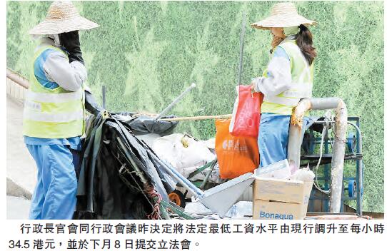 【香港商報网訊】記者周偉立報道:行政長官會同行政會議昨已接納最低工資委員會的建議,將法定最低工資水平由現行的每小時32.5港元調升至每小時34.5港元,增幅2元即6.2%。特區政府發言人昨日表示,《2017年最低工資條例(修訂附表3)公告》將於明日在憲報刊登,并於下月8日提交立法會,在立法會通過之后,經修訂的法定小時最低工資水平將於本年5月1日實施。